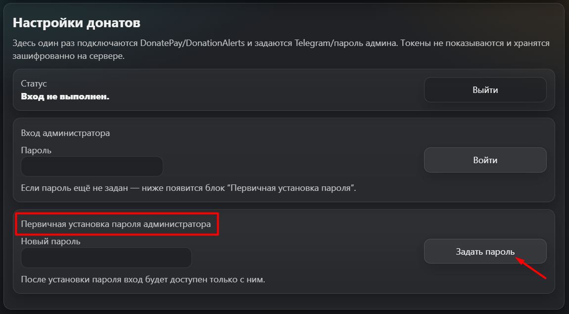- Если видишь блок “Первичная установка пароля администратора” - введи пароль и нажми кнопку "Задать пароль".