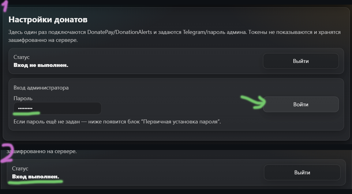 - Админка - настройка пароля, подключений DA/DP, Telegram Chat ID и стоимости стрима.