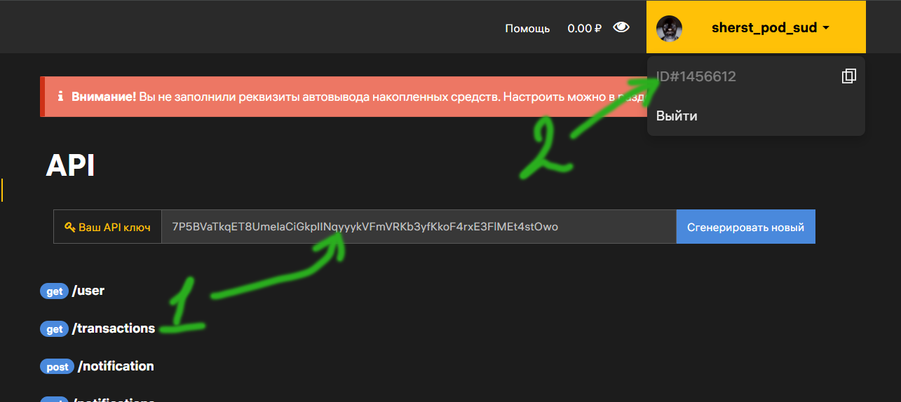 - В модальном окне вставь ключ и user_id.